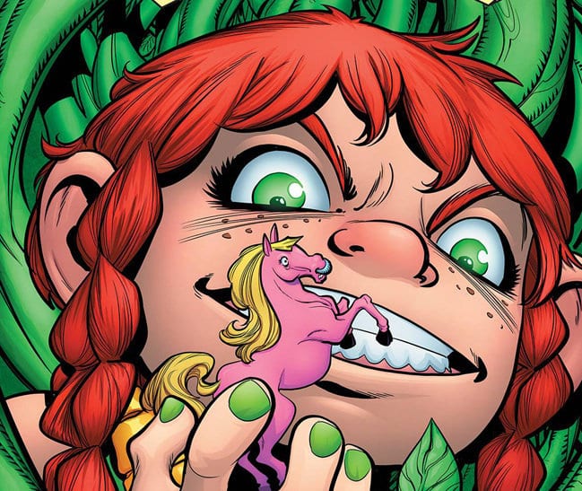 Norton and Passalaqua’s main cover for the book places all the focus on Bryony; she’s pictured in a mass of her own vines holding a miniature version of the Nobody’s Ponies boss, representing her power over them.