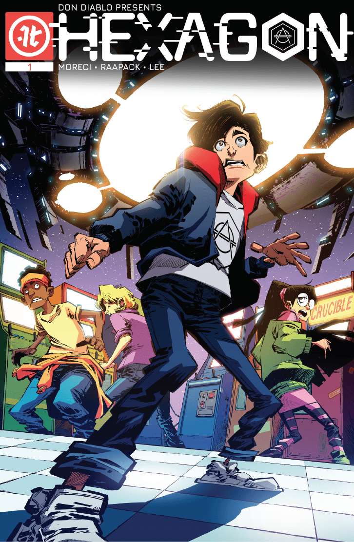 Protagonist Don Van Vliet just wants to join his friends in playing a popular arcade game, Crucible. His dad, however, won’t let him. Most gamers are familiar with the public debate of video games in the 80s, especially in how they might affect children’s minds. Surprisingly though, Mr. Van Vliet is a Yoda imitator and builds Gundam models. Nerd culture was kind of looked down upon in this time, so to see an adult okay with fandoms but not with arcade games is kind of interesting. Prior to meeting Mr. Van Vliet, however, readers see a player experience a devastating loss at Crucible. By the end of Hexagon #1, that opening scene serves as foreshadowing for the series’ plot.