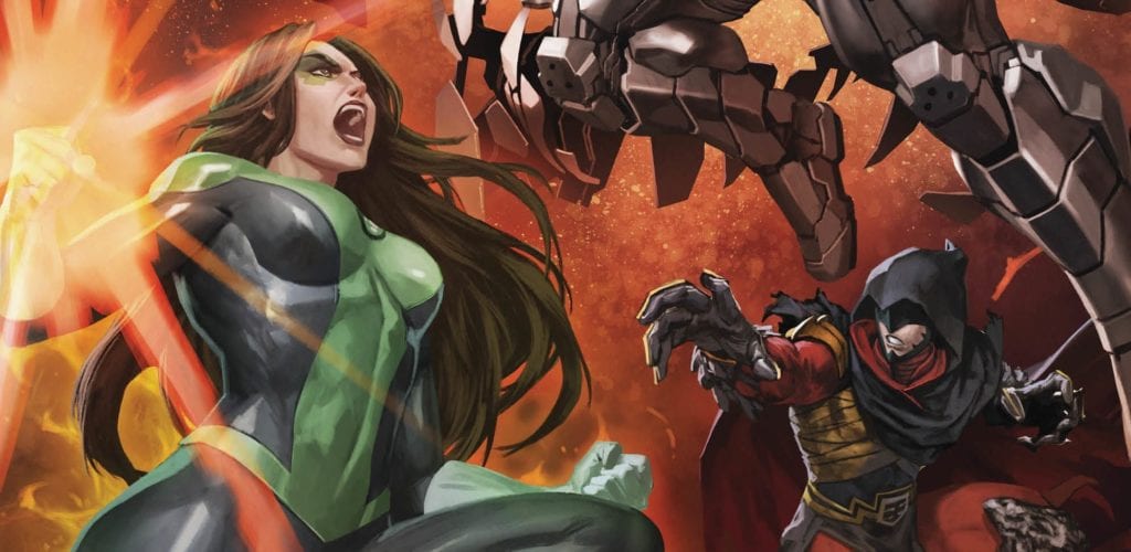 The threat of intergalactic war builds in JUSTICE LEAGUE ODYSSEY #18. Available in stores on Wednesday, February 5th, the issue brings all of our dispersed heroes together for the fight of their lives against the forces of Darkseid. With Orion and a new hero named Gamma backing her up, Jessica Cruz faces off against Xotar, one of the newly christened New Gods. But despite this being’s incredible power, the foe she dreads the most isn’t a foe at all—it’s a lost friend.