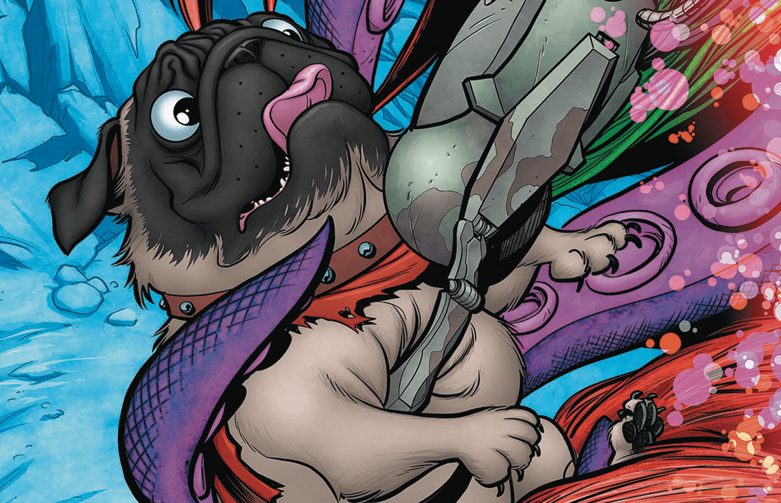 Gene Ha’s unique variant cover gives us an otherworldly version of Sprinkles, as if he was transformed into one of the beings from the dimension door. This effect makes us question the beloved dog’s true origins.