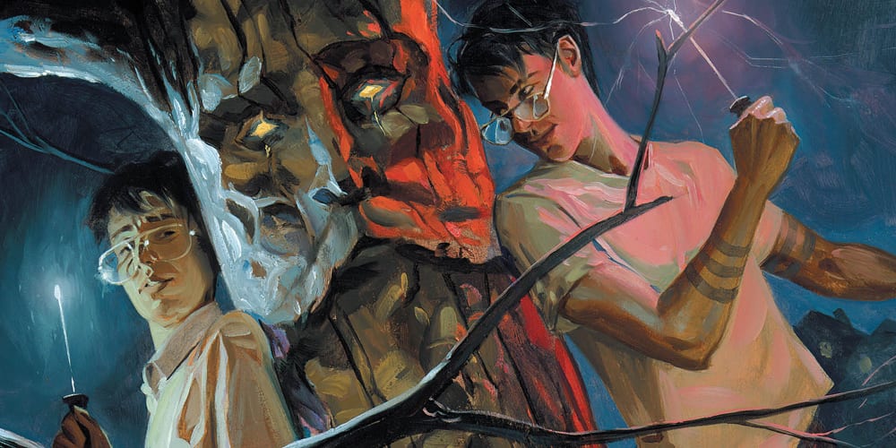 Kai Carpenter’s cover features Tim and his future self, opposing one another on either side of a mystical tree. This shows readers the animosity that will ultimately brew between them and the magic in the middle of it.